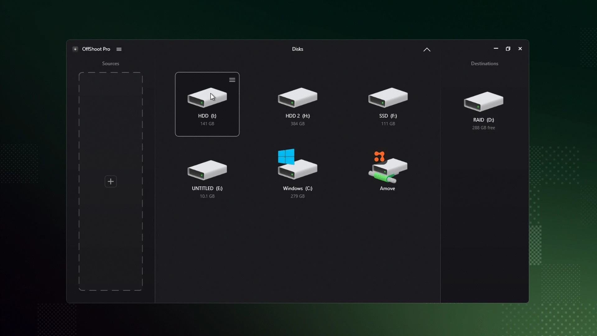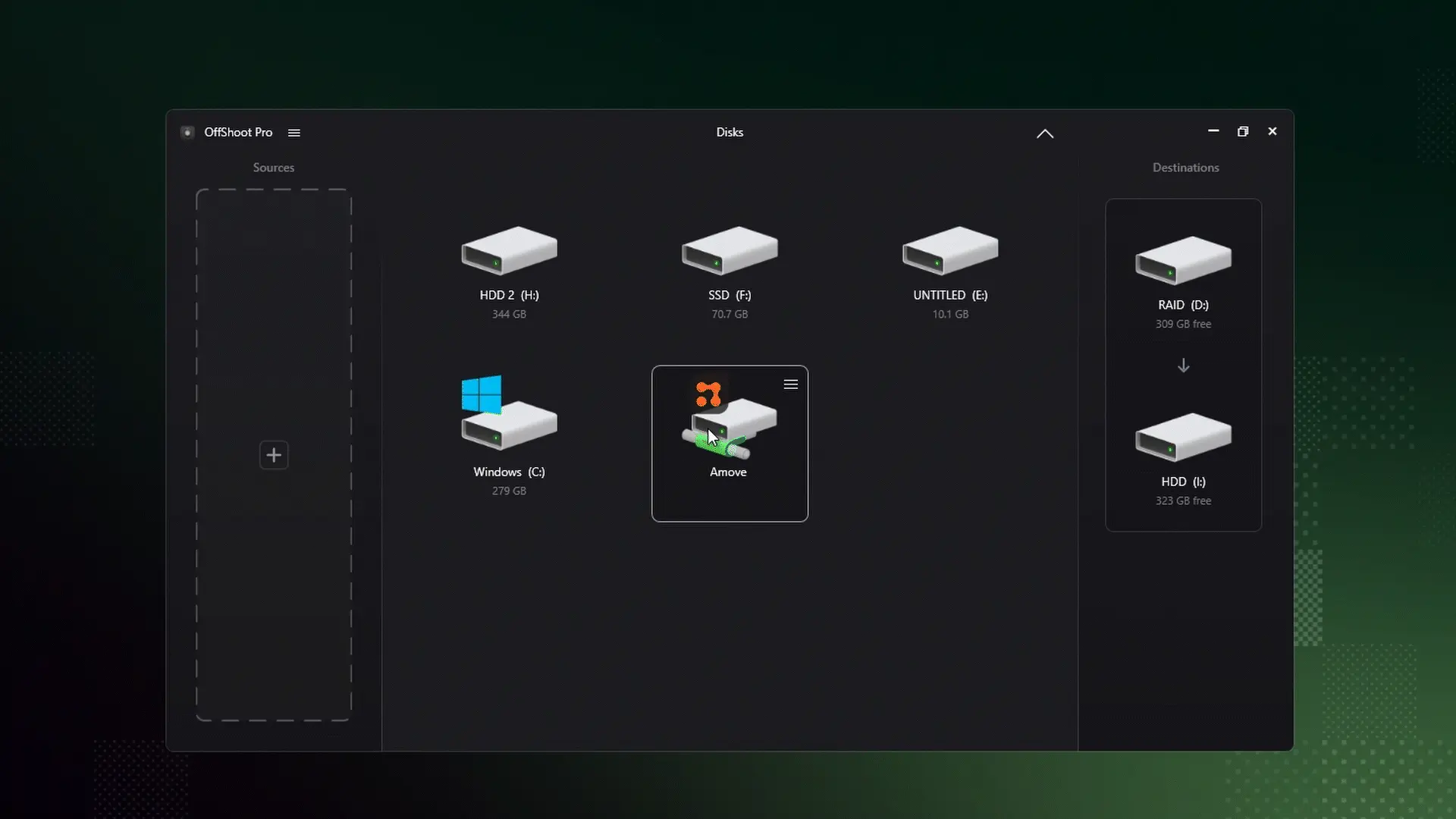 To set up Waterfall, drag your third drive on top of the second drive - that'll tell OffShoot to cascade from the secondary destination instead off the primary one. You can recognize a waterfall-ing drive by the arrow-signs in the UI: